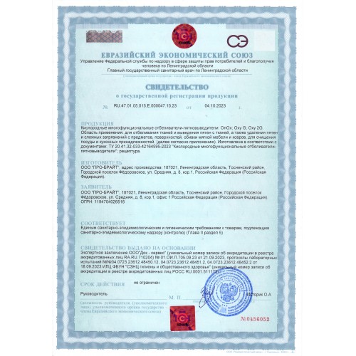 Препарат для отбеливания тканей и выведения пятен с тканей (кроме изделий из шерсти, шёлка, кожи, замши, деликатных и мембранных тканей), а также удаления пятен и сложных загрязнений с предметов, поверхностей, обивки мягкой мебели и ковров, для очищения посуды и кухонных принадлежностей (кроме повреждённых, деревянных, окрашенных и поверхностей из цветных метал-лов). Применимо для детских вещей.
