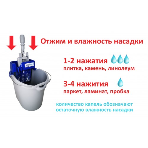 Комплект отличается простотой использования. Для отжима моющей насадки необходимо сложить швабру, вставить насадку в отжим и придавить сверху (2-3 раза) для её отжима.